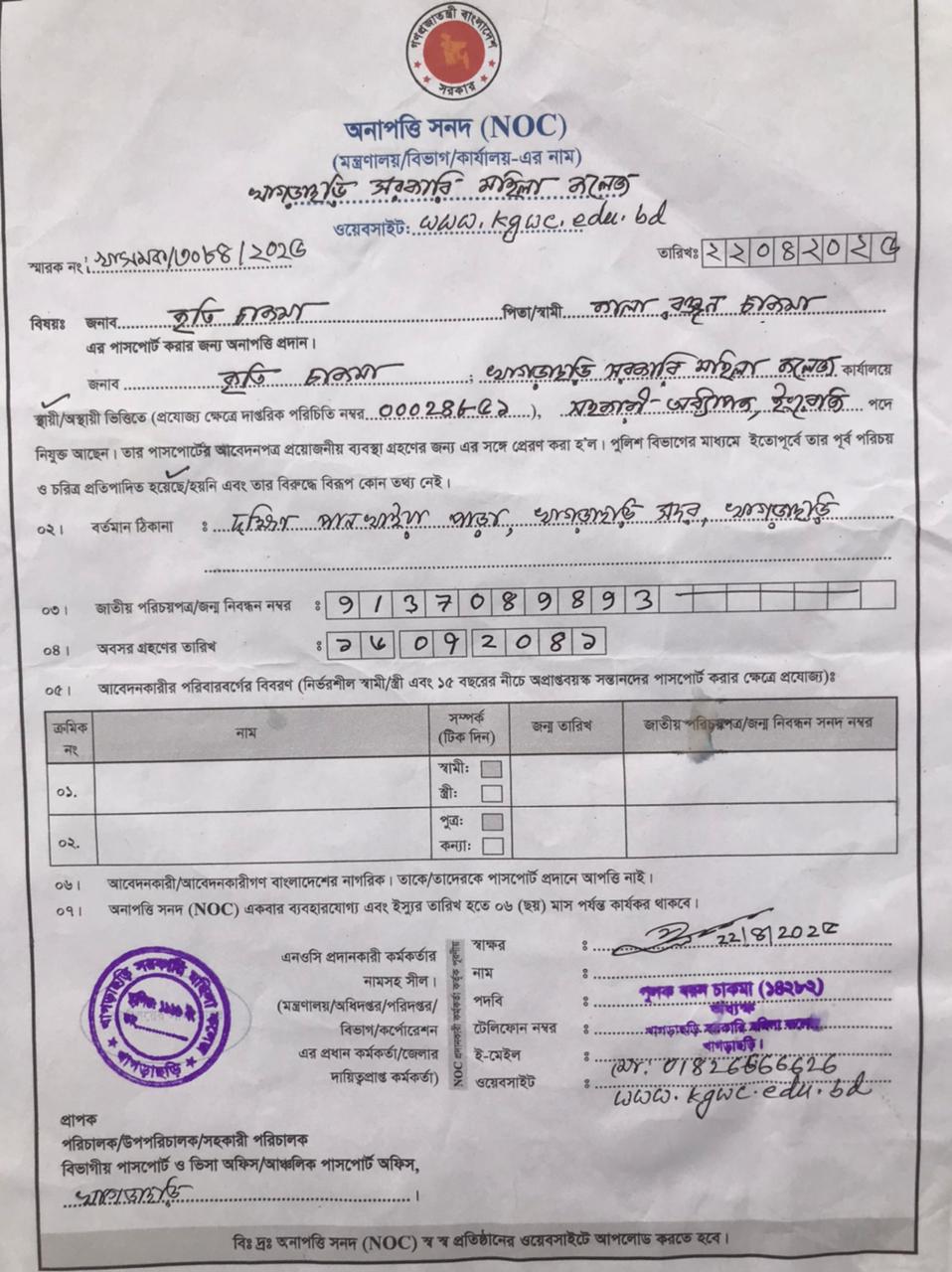 জনাব কৃতি চাকমা, সহকারী অধ্যাপক (ইংরেজি) এর অনাপত্তি সনদ (NOC)
