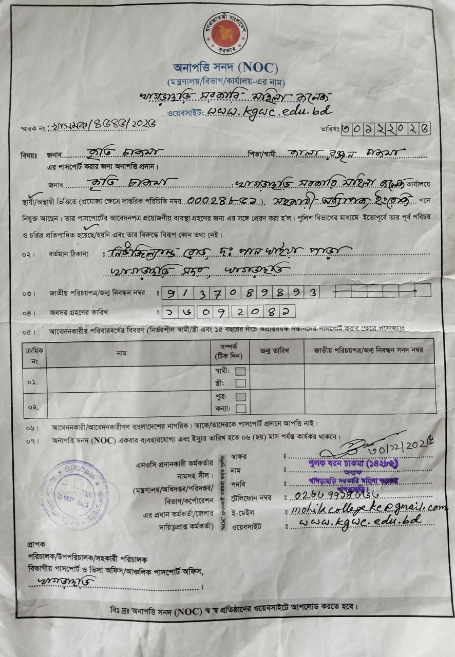জনাব কৃতি চাকমা, সহকারী অধ্যাপক (ইংরেজি) এর অনাপত্তি সনদ (NOC)